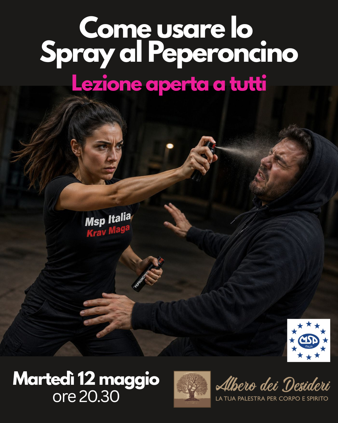 Si farà un’accenno alle leggi in vigore sulla legittima difesa e sul D.M. che regolarizza l’uso dello Spray, verranno illustrati i pro e i contro dell’utilizzo e in fine la dimostrazione pratica di come spruzzarlo.